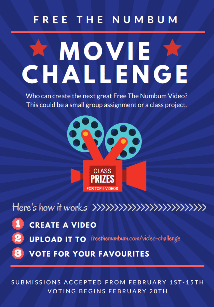 Free the Numbum has created a full course for students on how to create thier own awesome Free the Numbum videos. This is an excellent cross-curricular opportunity, a great class project and chance for students to become experts as they share their imagination and creativity.
