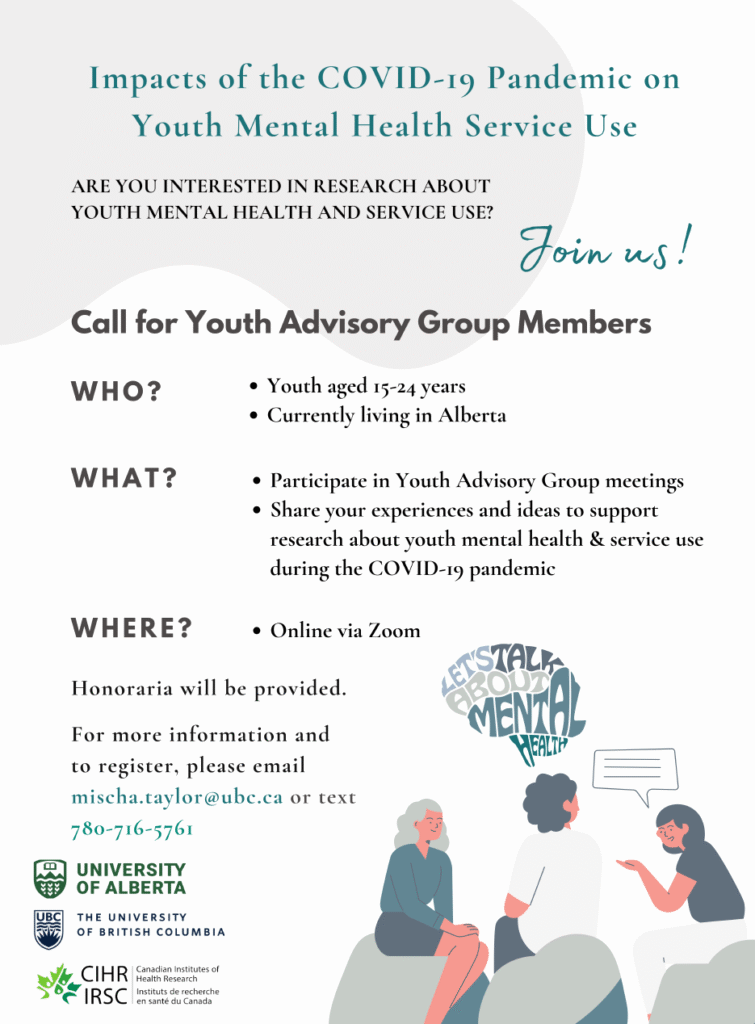 To participate in the Youth Advisory Group, you must be 15 to 24 years old (there is flexibility here), currently living in Alberta, and have access to Zoom.