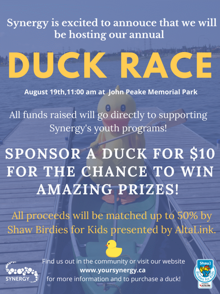 This year’s Sandbox Impact Program partner, Synergy, is hosting its annual Ducks for Bucks Fundraiser on August 19th at 11:00 AM. The fundraiser is an opportunity for the community to get together and raise funds to support youth and community development programs in Chestermere, Langdon, and SE Rocky View- Alberta.