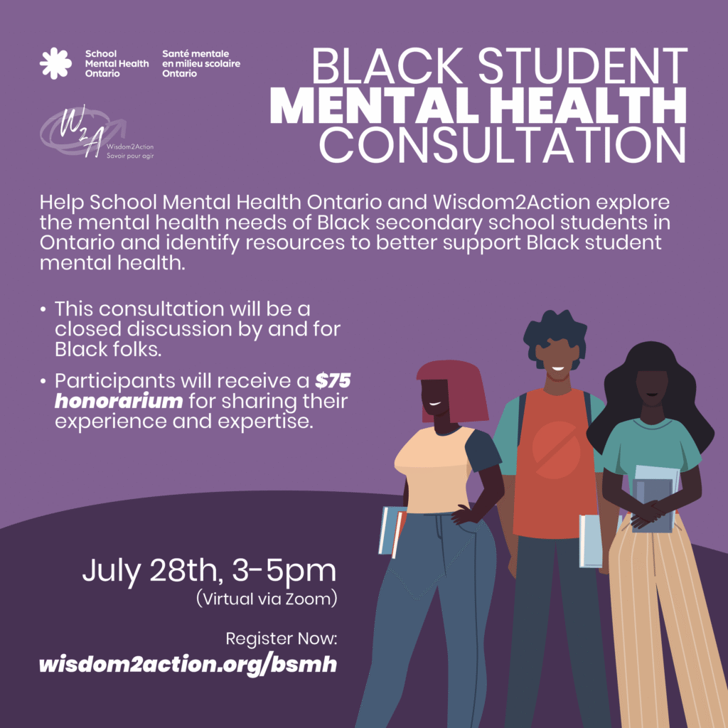 Wisdom2Action and School Mental Health Ontario will be holding a consultation on Black Student Mental Health in Ontario taking place on July 28th from 3-5PM EST. This consultation will bring together Black secondary school students in Ontario to explore how Wisdom2Action and School Mental Health Ontario can better support the mental health and well-being of […]